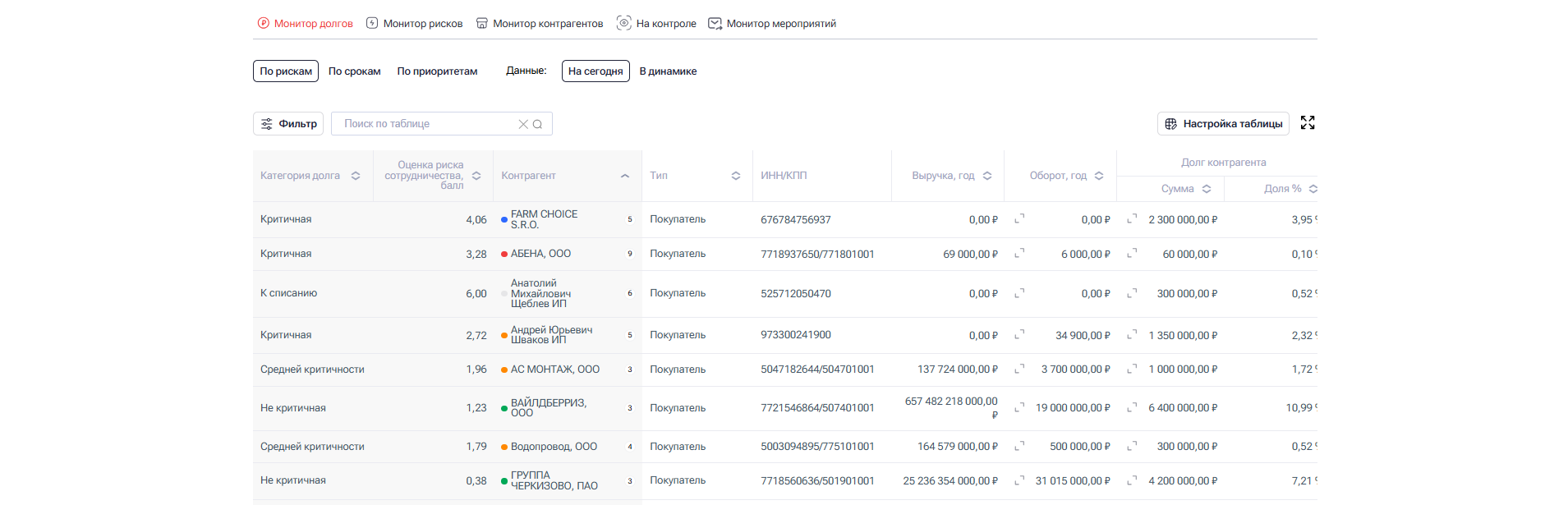 Система подсвечивает для каких контрагентов событие является критичным. И к каким потенциальным потерям могут привести